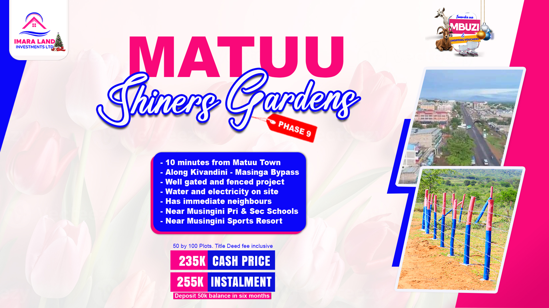 Location: 10 minutes from Matuu Town at Musingini. It’s located 1km from the tarmac